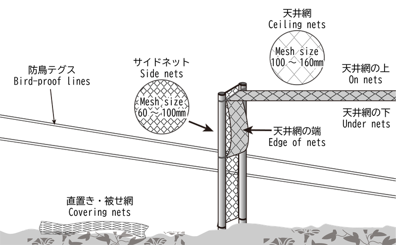 In general, the most reliable and effective measure against damage to crops caused by wild birds is to completely cover the crops with bird nets※1) span>.